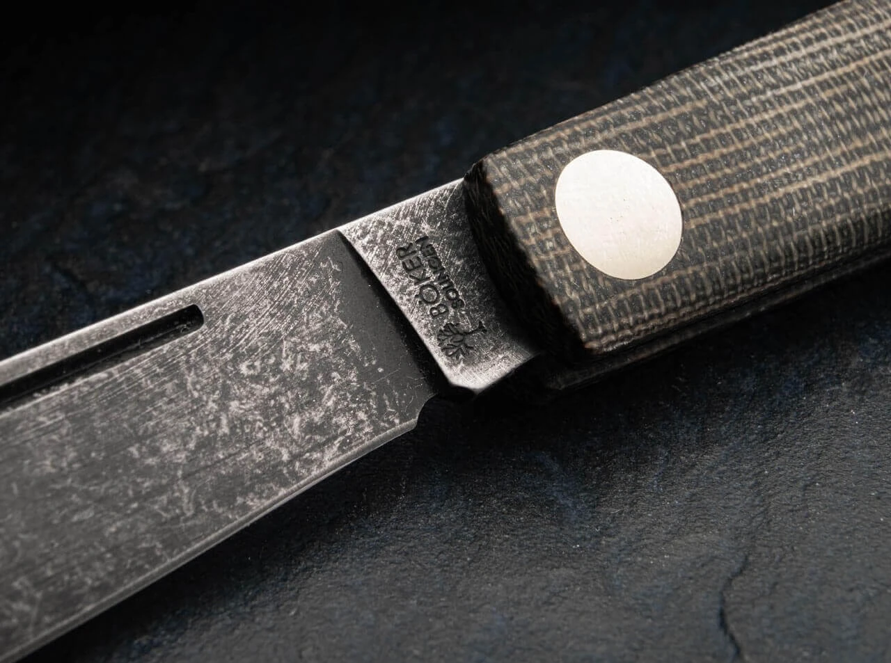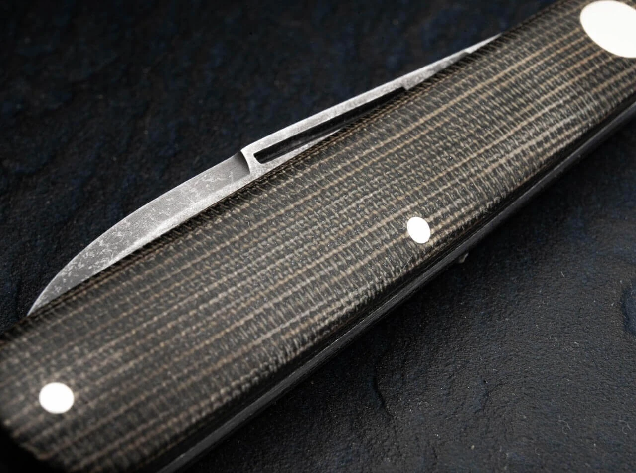 Diese in integralbauweise ausgeführte Version des neu interpretierten Böker Barlow Prime verzichtet auf die charakteristischen Backen und ist stattdessen mit durchgehenden, angenehm konturierten Griffschalen aus grünem Canvas Micarta ausgestattet. Die leichtgewichtige Konstruktion kann so komplett auf zusätzliche Liner aus Metall verzichten. Die Klinge wird aus dem nicht rostfreien Kohlenstoffstahl O1 gefertigt und ist mit einem speziellen Acid-Wash-Finish versehen. Sie ist mit einer modernen, langgezogenen Fehlschärfe versehen und wird per Nagelhau geöffnet. Die Bediensicherheit des Slipjoint-Taschenmessers wird durch eine 90 Grad Rastung beim Öffnen und Schließen erhöht. Die dekorativen Nieten bestehen aus Messing. Mit hochwertigem Filz-Etui zur Aufbewahrung. Handgefertigt in der Böker Messer-Manufaktur Solingen.