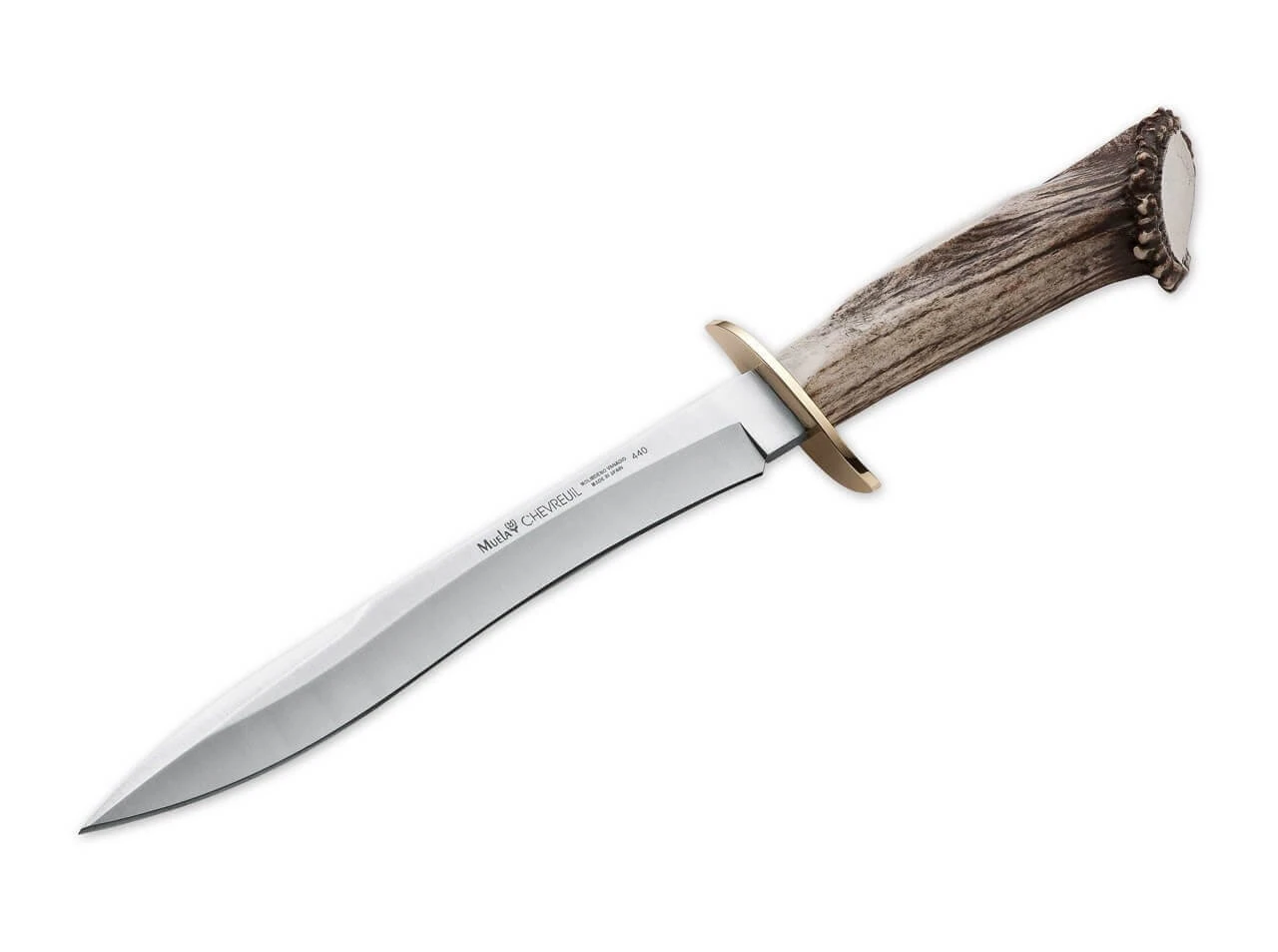 Der Hirschfänger Chevreuil von Muela ist mit einem Griff aus anmutiger Hirschkrone und einem dazu passenden Messing-Parierelement ausgestattet. Die einschneidige Klinge wird aus 4116 gefertigt, die hochwertige braune Scheide besteht aus Leder.