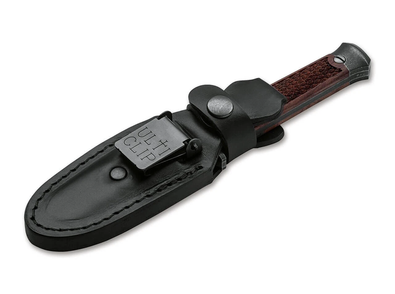 Backen und Abschlussknauf bestehen aus Stahl und werden mit einem dunklen Stonewash-Finish versehen. Lieferung mit hochwertiger schwarzer Lederscheide, die mit einem eingenähten Ulticlip versehen ist und dank der arretierenden Federklammer bequem befestigt werden kann. So lässt sich der Böker P08-Damast Stiefeldolch mühelos ziehen, während die Scheide vom Ulticlip zuverlässig an Ort und Stelle gehalten wird. Handgefertigt in der Böker Messer-Manufaktur Solingen. Mit edlem Schwebedisplay, Echtheitszertifikat und individueller Seriennummer.