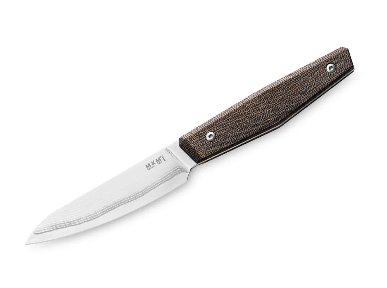 Der bekannte Messerdesigner Jens Anso greift zu Kochlöffel und Zeichenbrett und zaubert Gourmets mit der MKM Prima Serie ein vollmundiges Menü feinster Kochmesser auf den Tisch. Das Gemüsemesser eignet sich ideal zum Schneiden und Zerkleinern von Gemüse und Obst. Auch zum Schälen oder als kleines Allzweckmesser in der Küche ist das Gemüsemesser oft die bevorzugte Wahl vor dem großen Chefmesser. In dieser besonderen Version ist das MKM Prima Gemüsemesser mit einer edlen Takefu Damast-Klinge mit 65 Lagen bei einer Härte von 61-63 HRC ausgestattet. Typisch Anso gestaltet sich der Griff aus gold-schwarzem FAT-Carbon, der übliche Konventionen zu Gunsten moderner, kantiger Linien ausklammert.