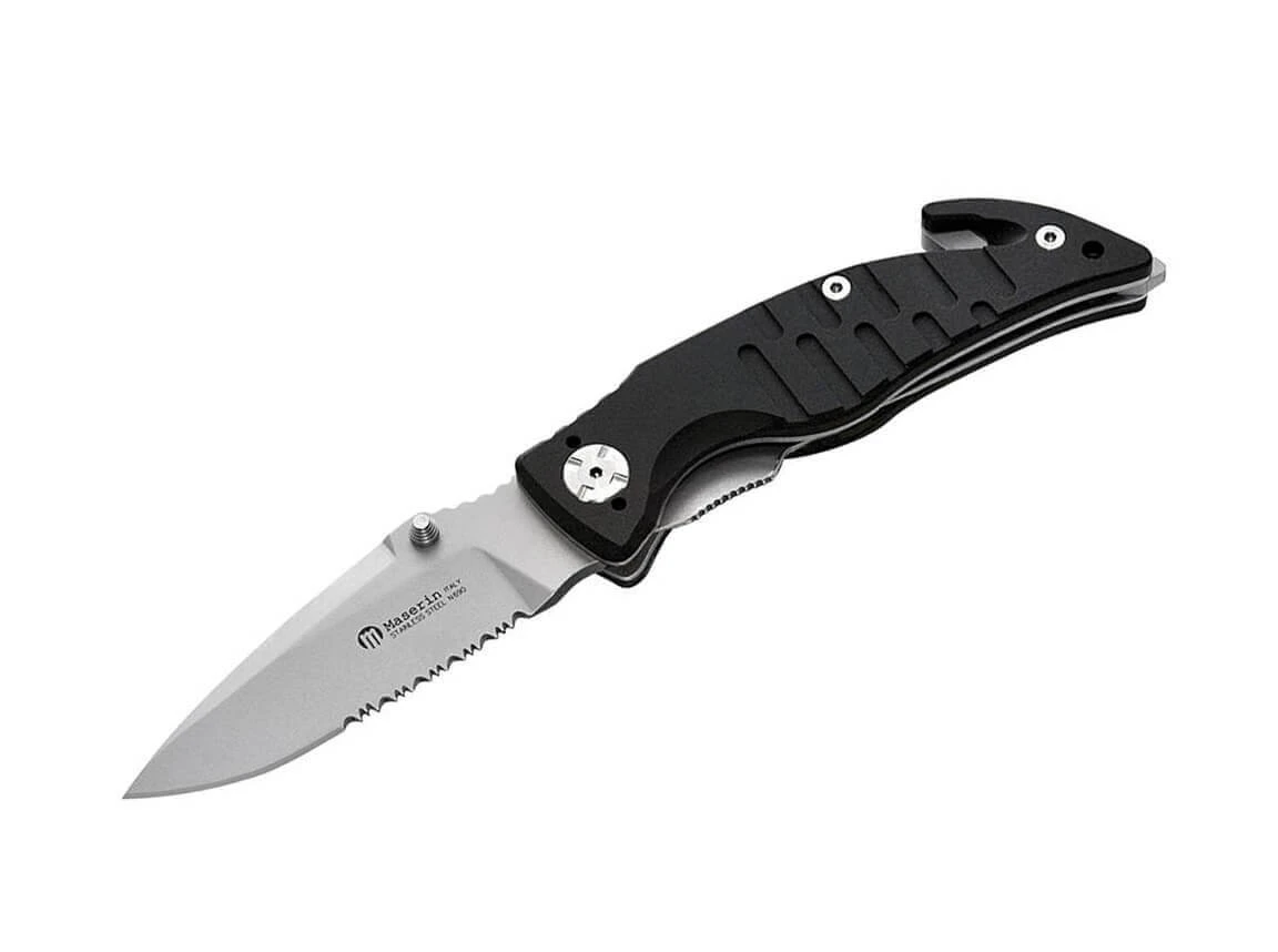 Das Maserin Rescue-2 I ist ein praktisches Rettungsmesser mit Gurtschneider und Glasbrecher. Die Klinge mit Teilwellenschliff wird aus N690 gefertigt und durch einen Linerlock verriegelt. Als Öffnungshilfe kommt ein klassischer Daumenpin zum Einsatz. Der schwarze Aluminiumgriff ist stark strukturiert und liegt so auch bei Nässe und Feuchtigkeit sicher in der Hand. Mit abnehmbarem Clip.