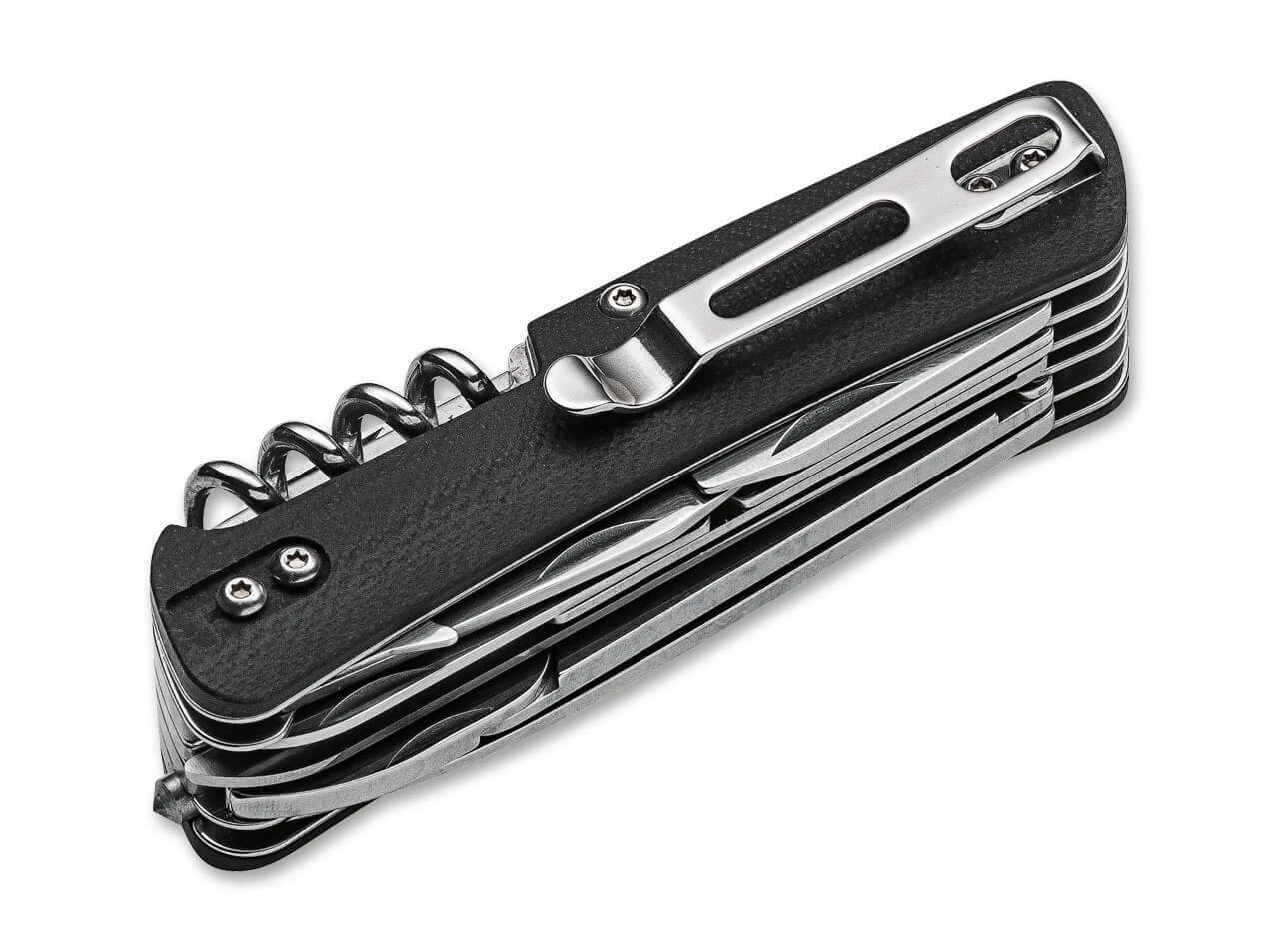 Ausgerüstet mit einer großen Klinge (12C27) und folgenden Werkzeugen (4Cr13): Glasbrecher, großer Schraubendreher mit Flaschenöffner und Drahtbieger/-abisolierer, kleine Wellenschliffklinge mit Schraubendreherspitze, ausklappbare Fangriemenöse, Korkenzieher, Schere, Näh-/Bohrahle, Zange, Holzsäge, Clip. Griffdicke 27mm.